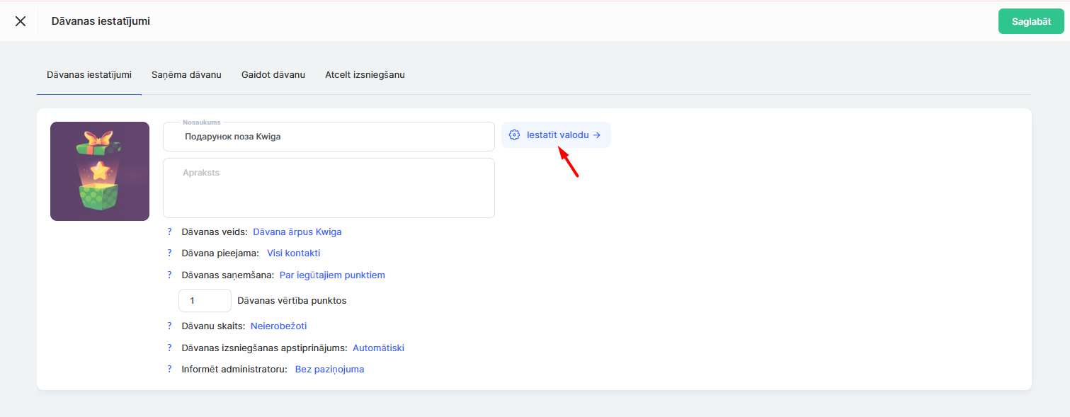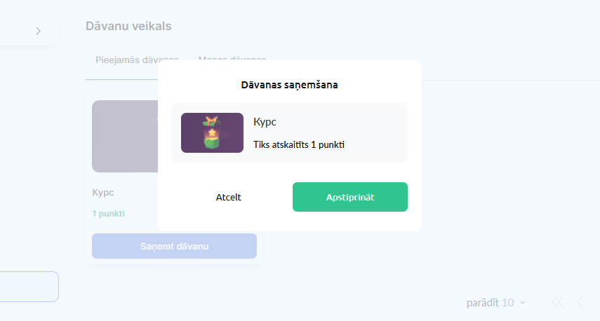 Par uzkrātajiem punktiem — students var apmainīt dāvanu pret uzkrātajiem punktiem. Laukā “Dāvanas izmaksas punktos” norādiet apmaiņai nepieciešamo punktu skaitu (piemēram, 10 punkti). Nosakot izmaksas, ņemiet vērā punktu iegūšanas vieglumu platformā, dāvanas reālo vērtību un vēlamo tempu līdz balvas saņemšanai.