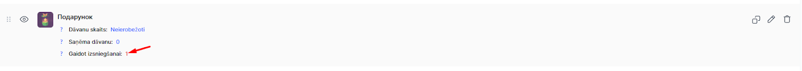 Lai apstiprinātu dāvanas piegādi, administratoram jādodas uz “Gamifikācija, lojalitāte → Dāvanu veikals” un jānoklikšķina uz skaitļa blakus laukam “Gaida piegādi”.
