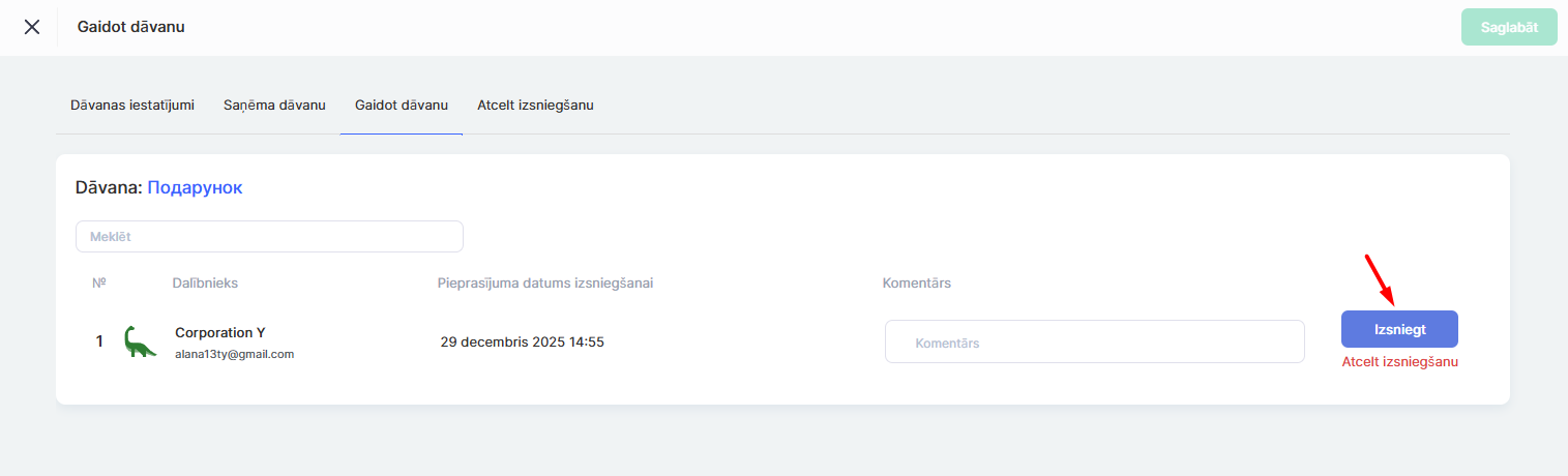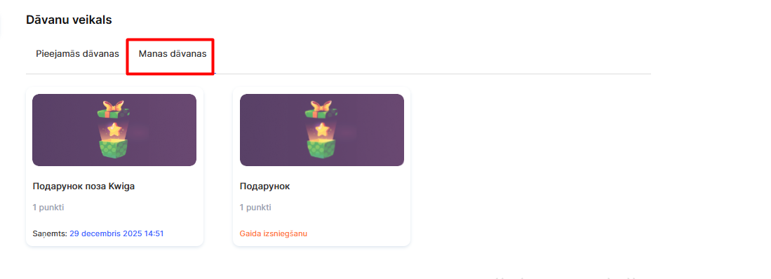 Automātiskajā režīmā piekļuve tiek piešķirta nekavējoties. Ja dāvanas piegādes apstiprināšana ir iestatīta uz “Administratora apstiprinājums”, dāvana parādās cilnē “Manas dāvanas” ar statusu “Gaida piegādi”.