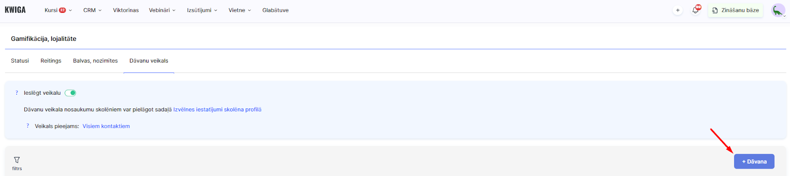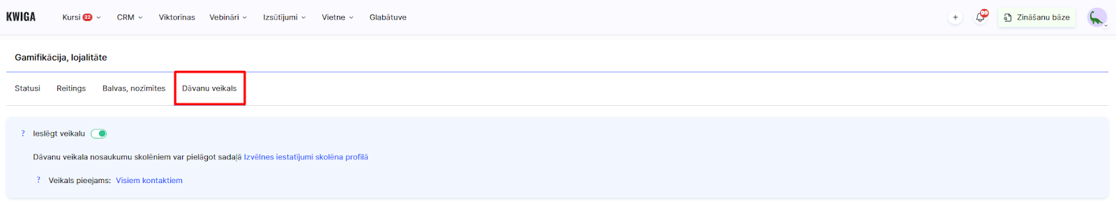 Dāvanu veikals ir ērts gamifikācijas rīks Kwiga platformā, kas ļauj izveidot balvas studentu motivēšanai. Šī funkcija palīdz veicināt aktivitāti, piedāvājot studentiem iespēju apmainīt uzkrātos punktus pret dažādām dāvanām.