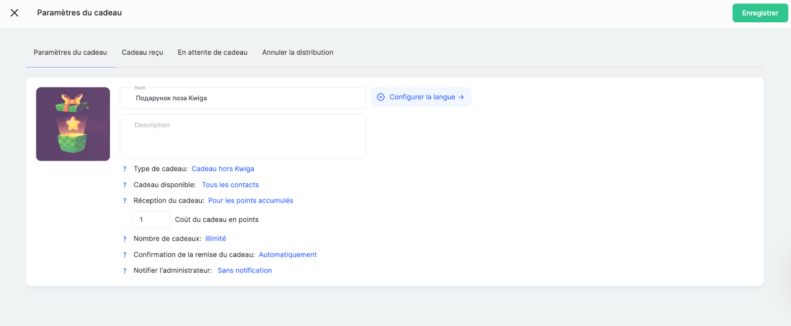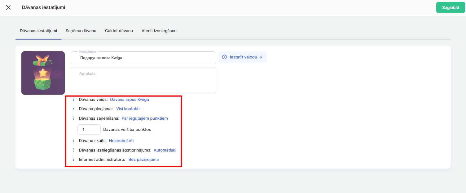 Dāvana ārpus Kwiga — jūs pievienojat dāvanas attēlu un aprakstu, bet nododat to dalībniekam, izmantojot jebkuru ārēju metodi.