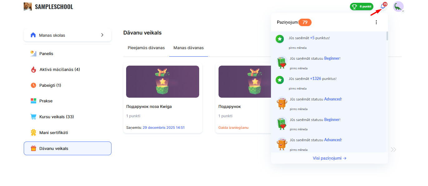 Kad dāvana ir saņemta, dalībnieks redz apsveikuma ziņojumu un saņem paziņojumu zvaniņa ikonas veidā savā profilā.