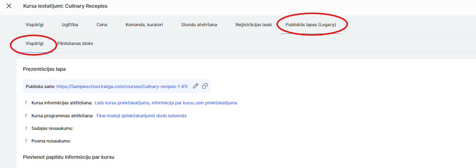 Publisko lapu cilnē izvēlies sadaļu Vispārīgi, pēc tam ritini uz leju līdz Nodarbības / moduļa lapa.