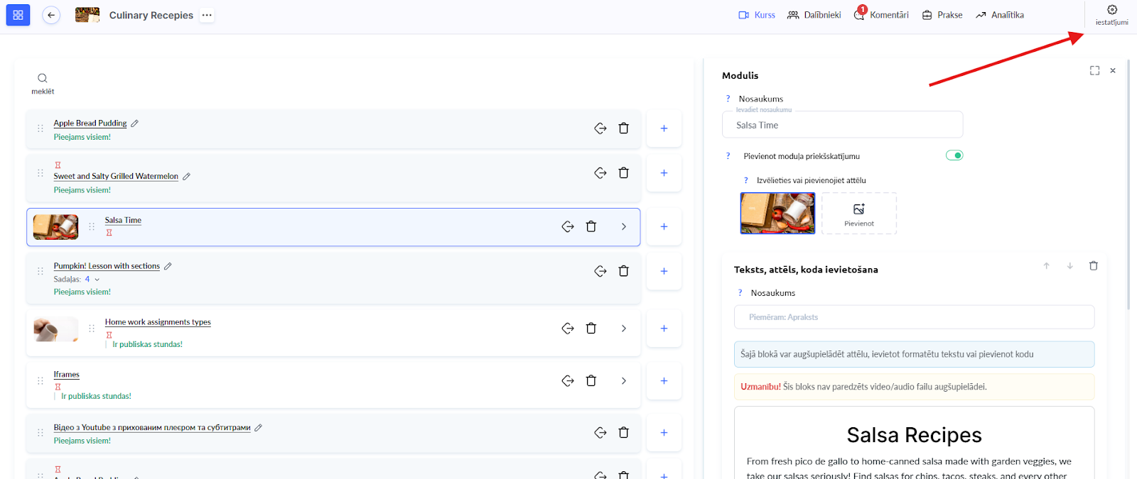 Bloka iestatīšana aizņems tikai dažas minūtes. Atver vēlamo kursu un dodies uz sadaļu Iestatījumi.