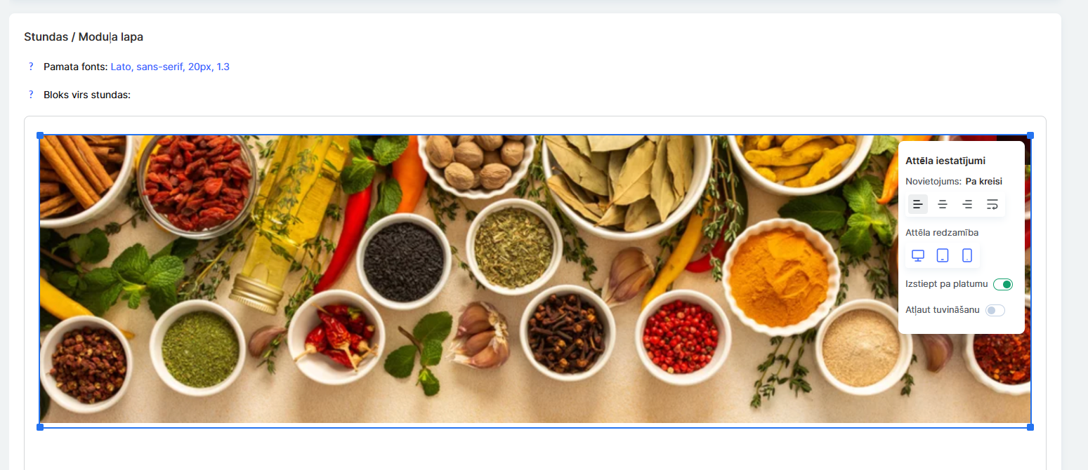 Kad tu pievieno attēlu blokam virs nodarbībām, tu vari noteikt, kā tas tiks parādīts uz dažādām ierīcēm.