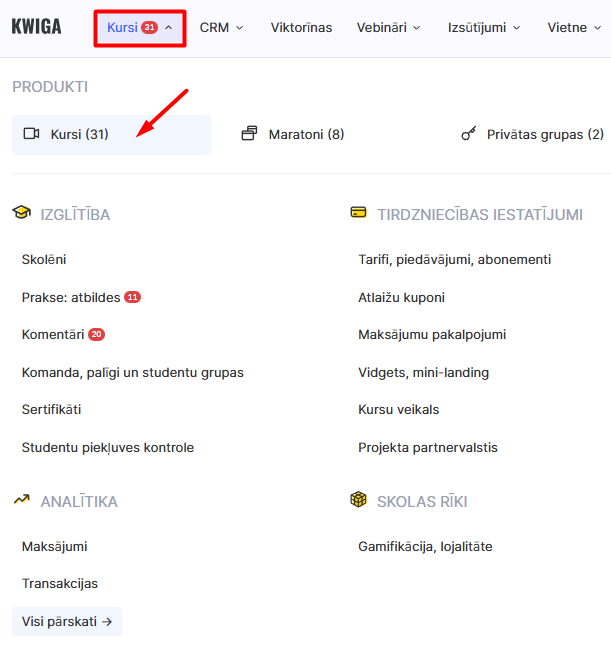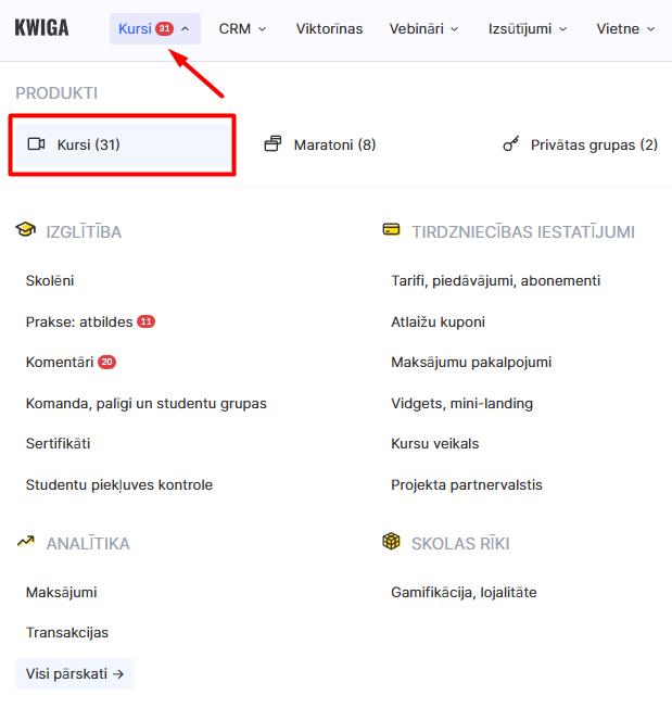 Dodieties uz sadaļu Kursi augšējā izvēlnē un izvēlieties produktu Kursi.