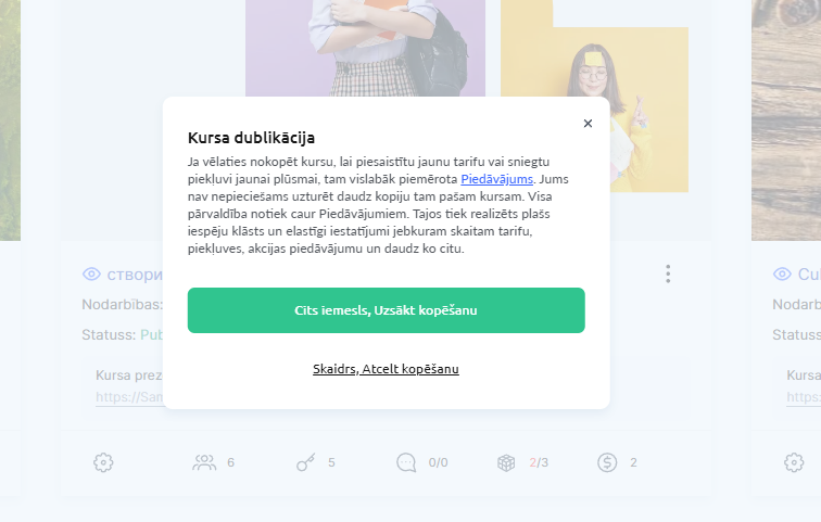 Šādā gadījumā varat atteikties no kursa dublēšanas, noklikšķinot uz Labi → Atcelt kopēšanu, un pēc tam doties uz Kursi → Cenu plāni, piedāvājumi, lai konfigurētu piekļuvi.