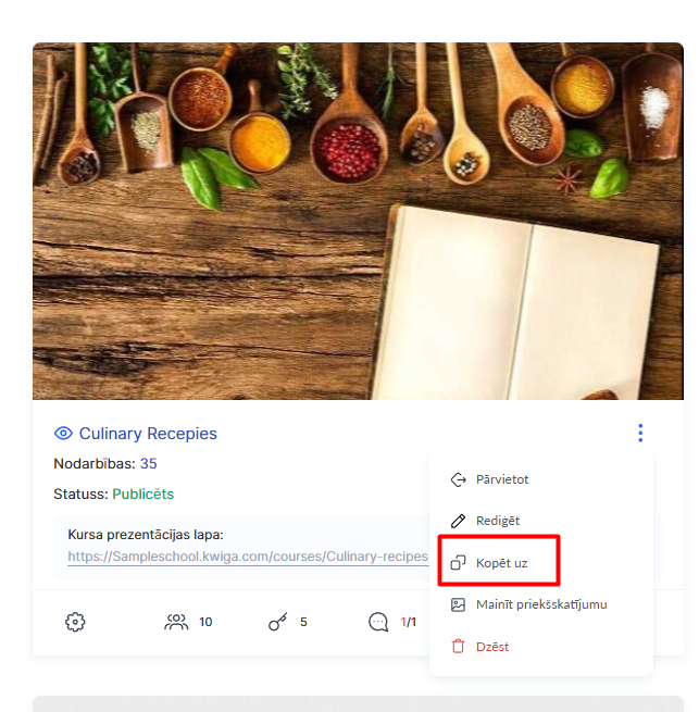 Kā izveidot sava kursa dublikātu Kwiga, kopējot materiālus, praktiskos uzdevumus un katras lekcijas iestatījumus.