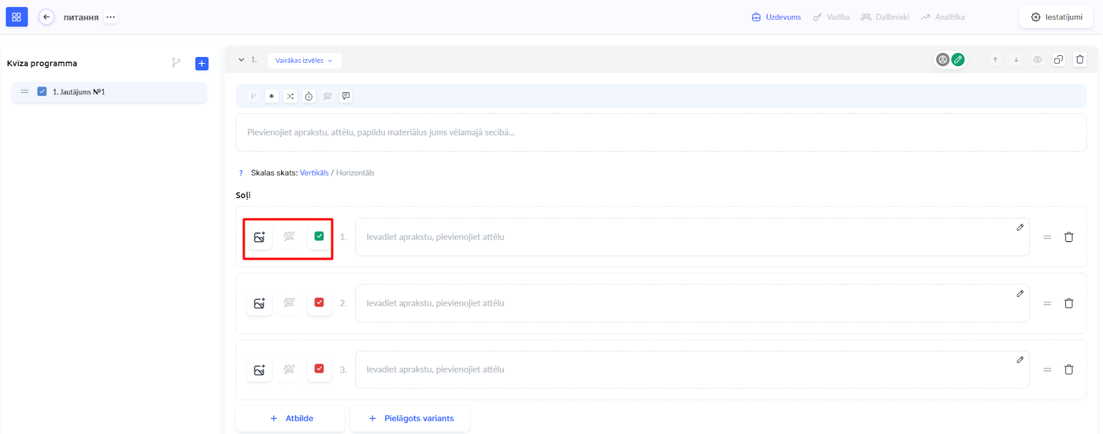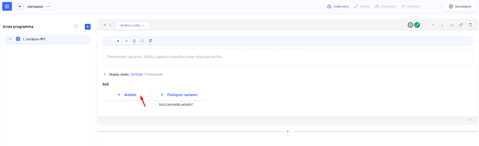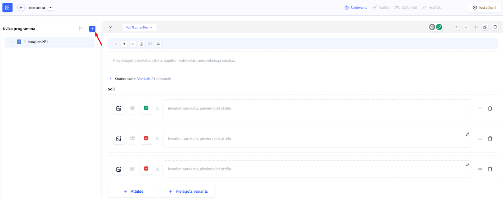 Ievadi jautājuma tekstu un atbilžu variantus, noklikšķinot uz pogas + Atbilde. Tu vari piešķirt punktus pareizajām atbildēm un atzīmēt tās zaļā krāsā.