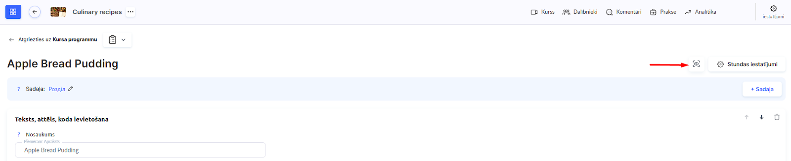 Pēc uzdevuma pievienošanas studenti to redzēs nodarbības saturā. Tu vari izmantot priekšskatījuma funkciju, lai pārliecinātos, ka viss ir pareizi: atver Nodarbību redaktoru, pārej uz priekšskatījuma režīmu un pārbaudi, kā uzdevums izskatās no studenta skatpunkta.