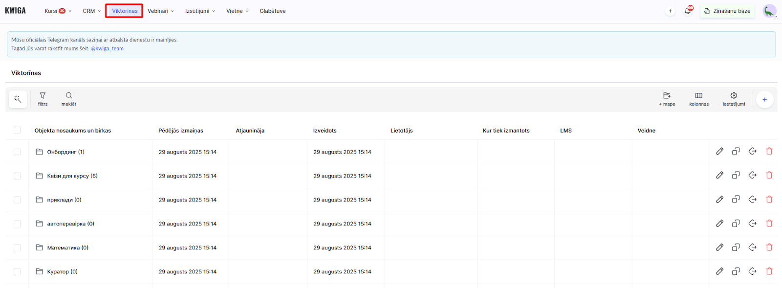 Kwiga platforma ļauj izveidot testus, kas atvieglo studentu zināšanu novērtēšanu. Testi tiek veidoti atsevišķi no nodarbībām un atrodas sadaļā Viktorīnas.