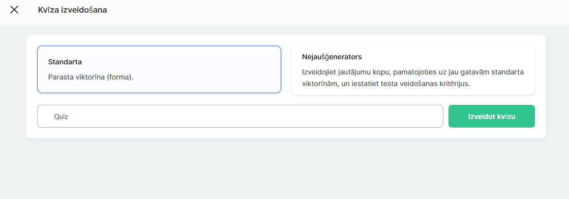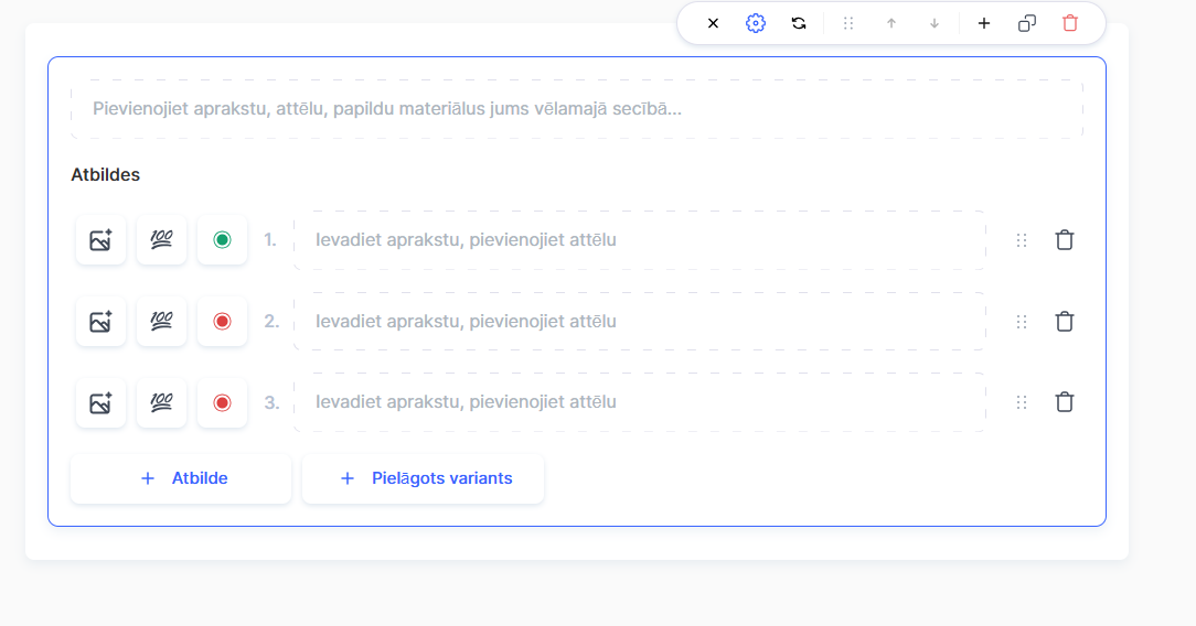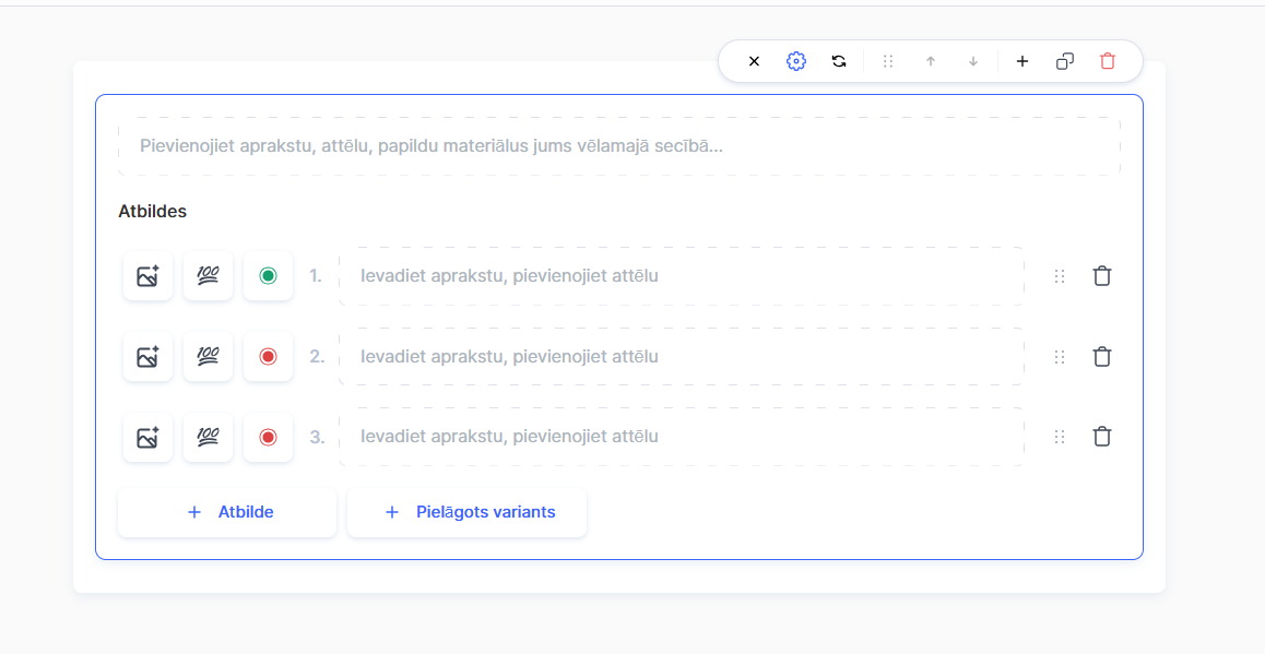 Pēc šī soļa jūs tiksiet novirzīts uz testa redaktoru, kur varēsiet pievienot jautājumus, izvēloties vēlamo jautājuma veidu: teksta atbilde, aizpildāms teksts, atbilžu izvēle (multiple choice) u. c.