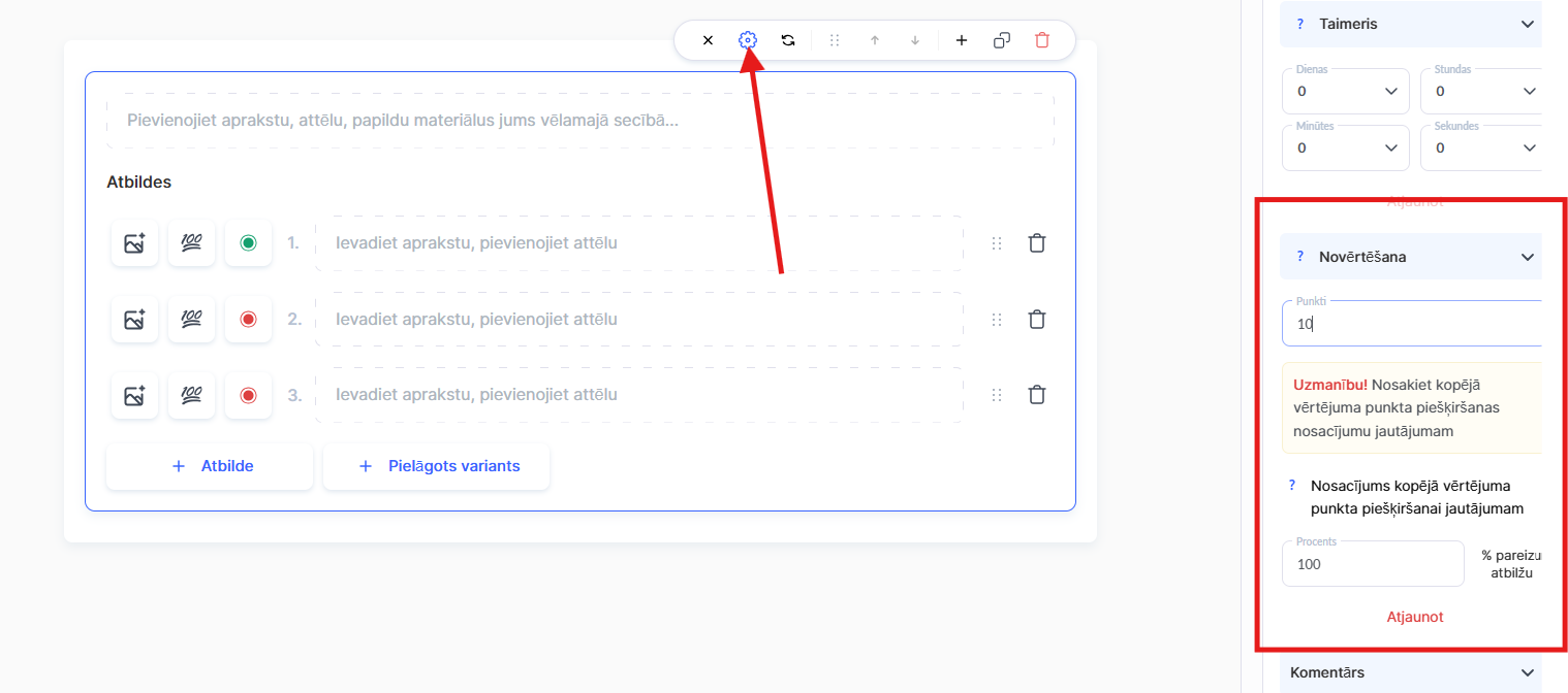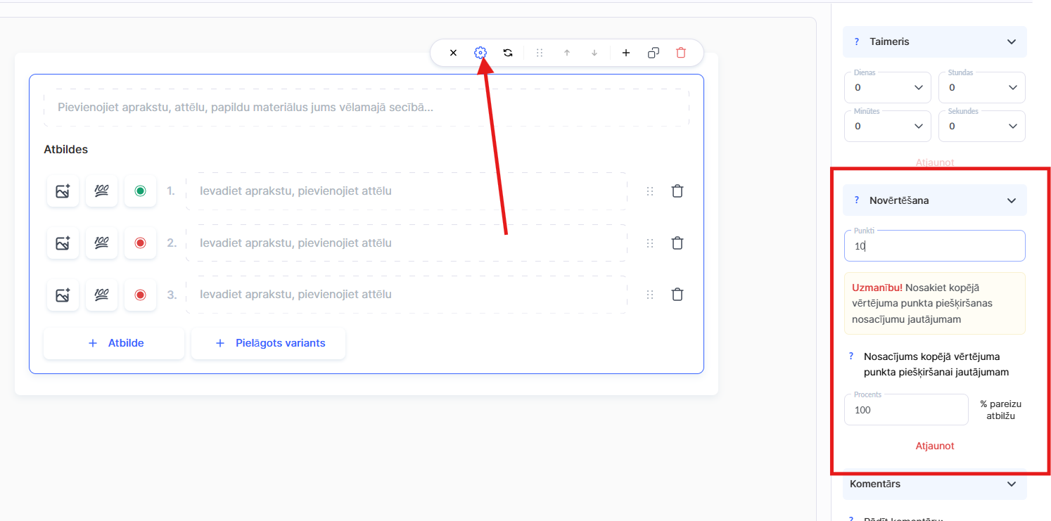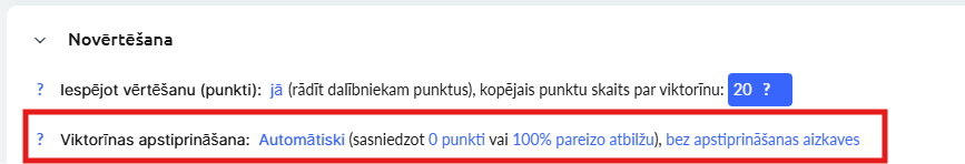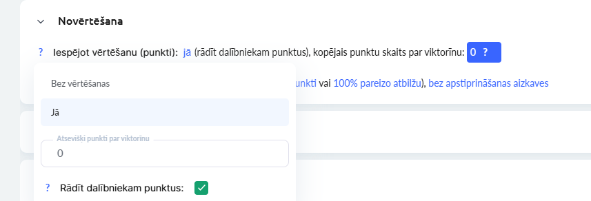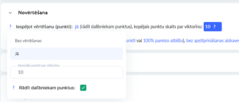 ● Punkti — izvēles parametrs, kas ļauj noteikt punktu skaitu, ko students saņem par pareizu atbildi