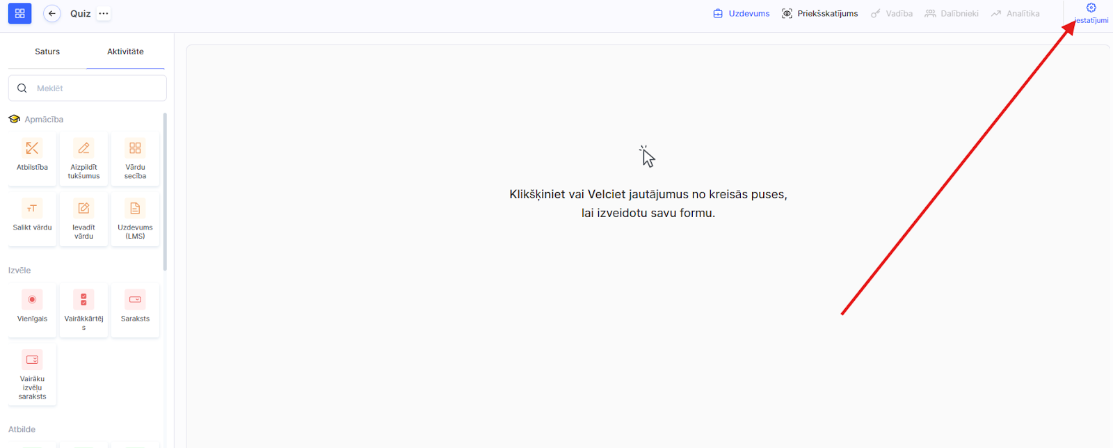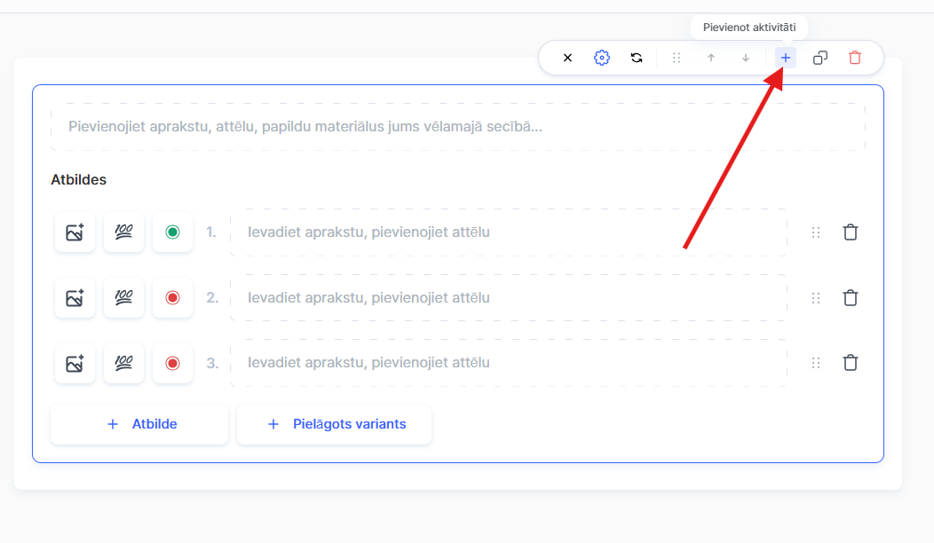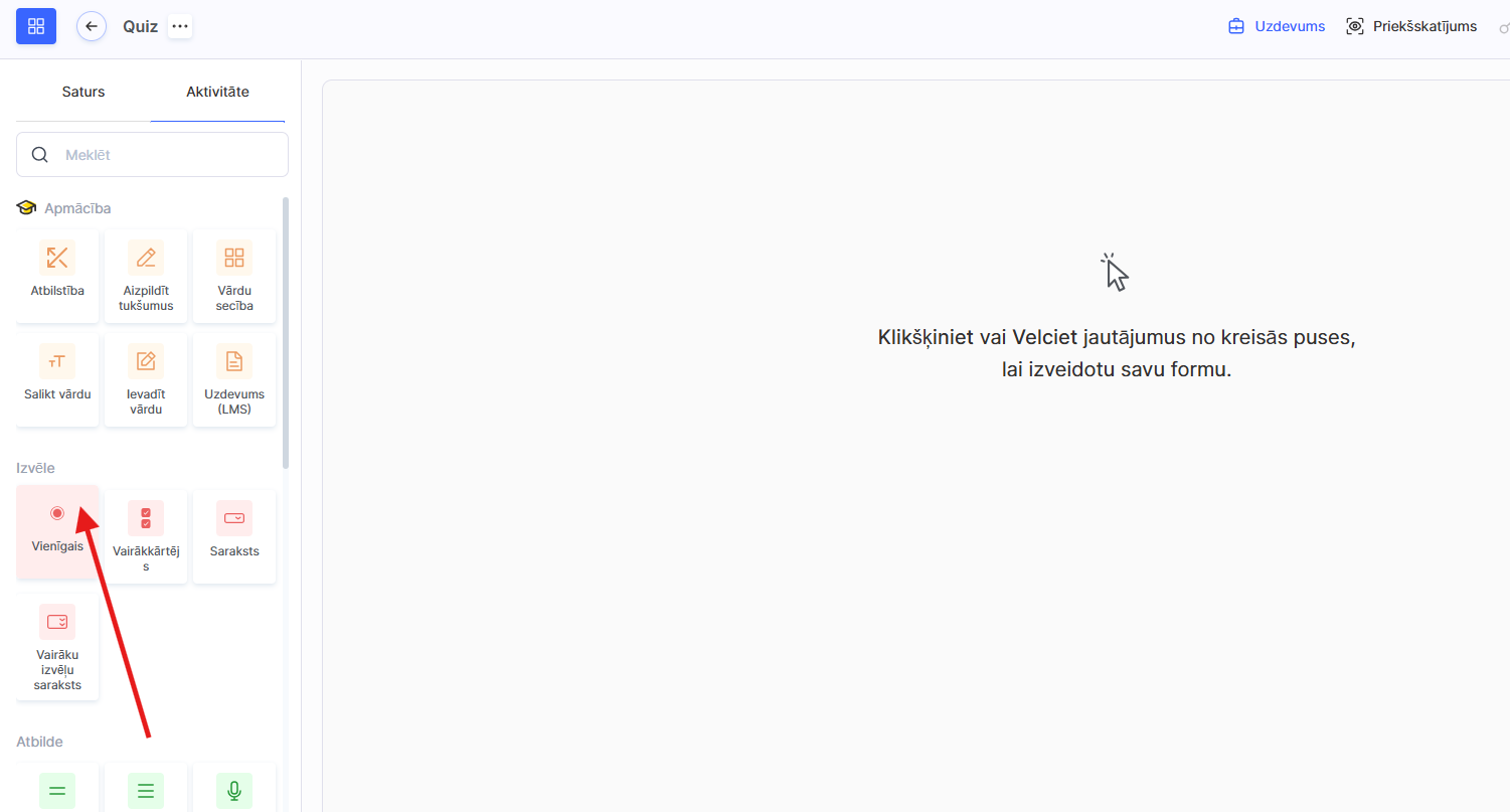 Katrs jauns jautājums tiek pievienots, izmantojot pogu + Pievienot aktivitāti vai noklikšķinot uz izvēlētā jautājuma veida kreisajā panelī.