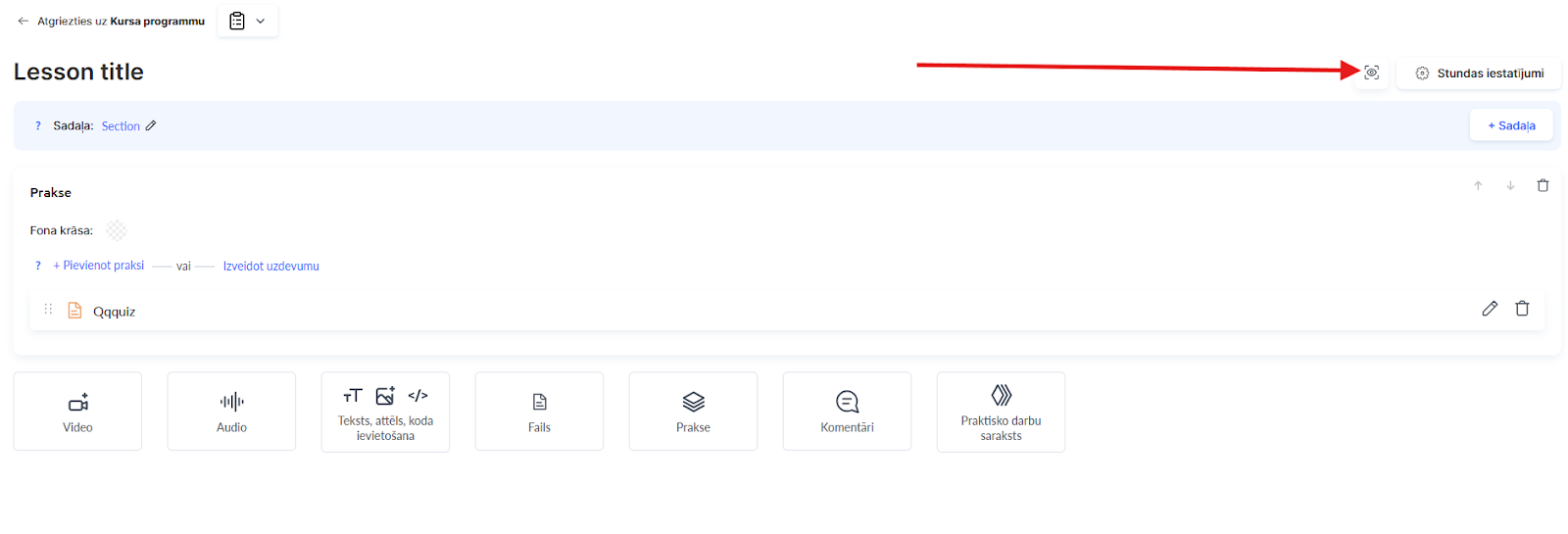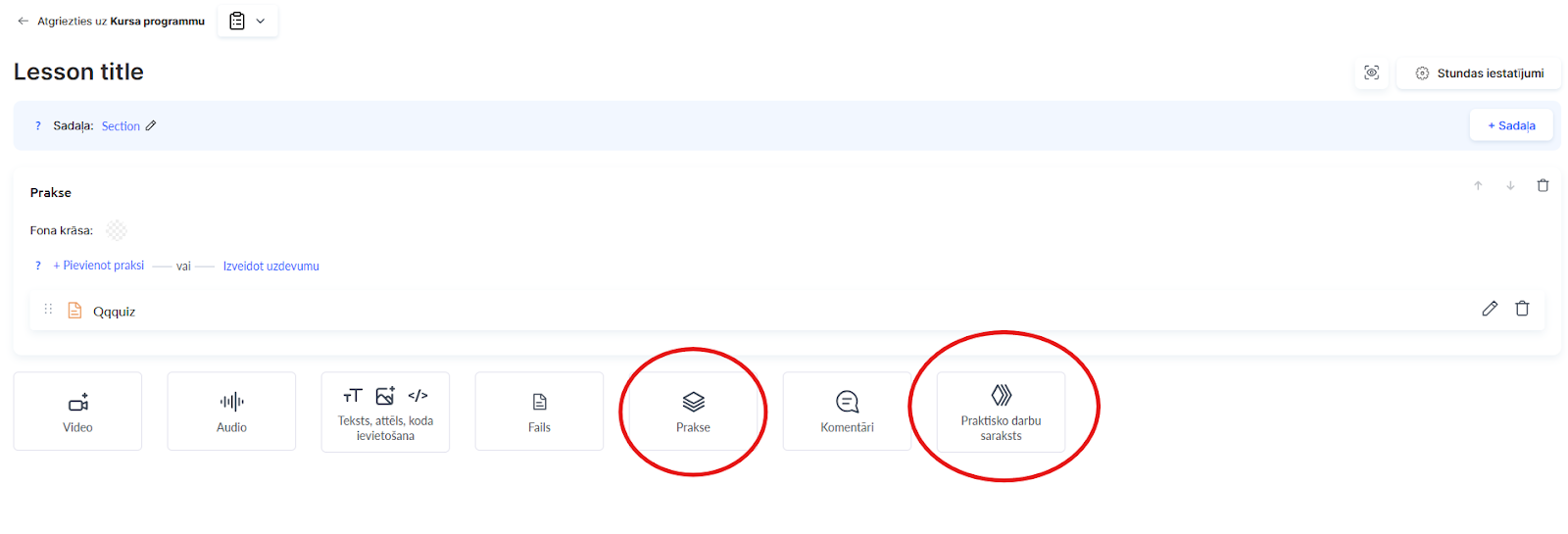 Lai pievienotu testu nodarbībai, atveriet attiecīgo nodarbību un pievienojiet viktorīnu, izmantojot tam paredzēto bloku.
