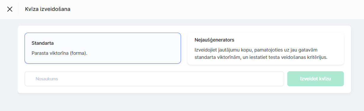 Pēc tam izvēlieties Standarta viktorīna, ievadiet tās nosaukumu un pārejiet pie satura aizpildīšanas.