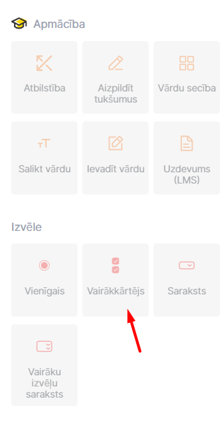 Kreisajā panelī ir pieejami visi jautājumu veidi, sakārtoti kategorijās ērtākai meklēšanai un lietošanai.