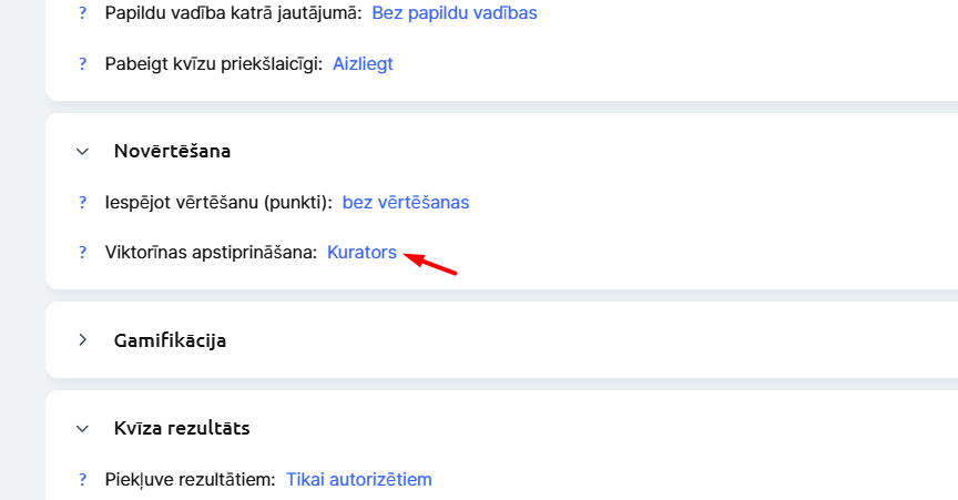 Uzdevumiem, kuriem nepieciešama manuāla pārbaude, viktorīnas iestatījumos ir jāiestata opcija Apstiprināšana — kurators.