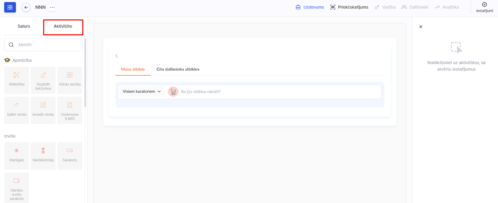 Lai pievienotu vēl vienu aktivitāti (jautājumu), noklikšķiniet uz + iestatījumos virs jautājuma