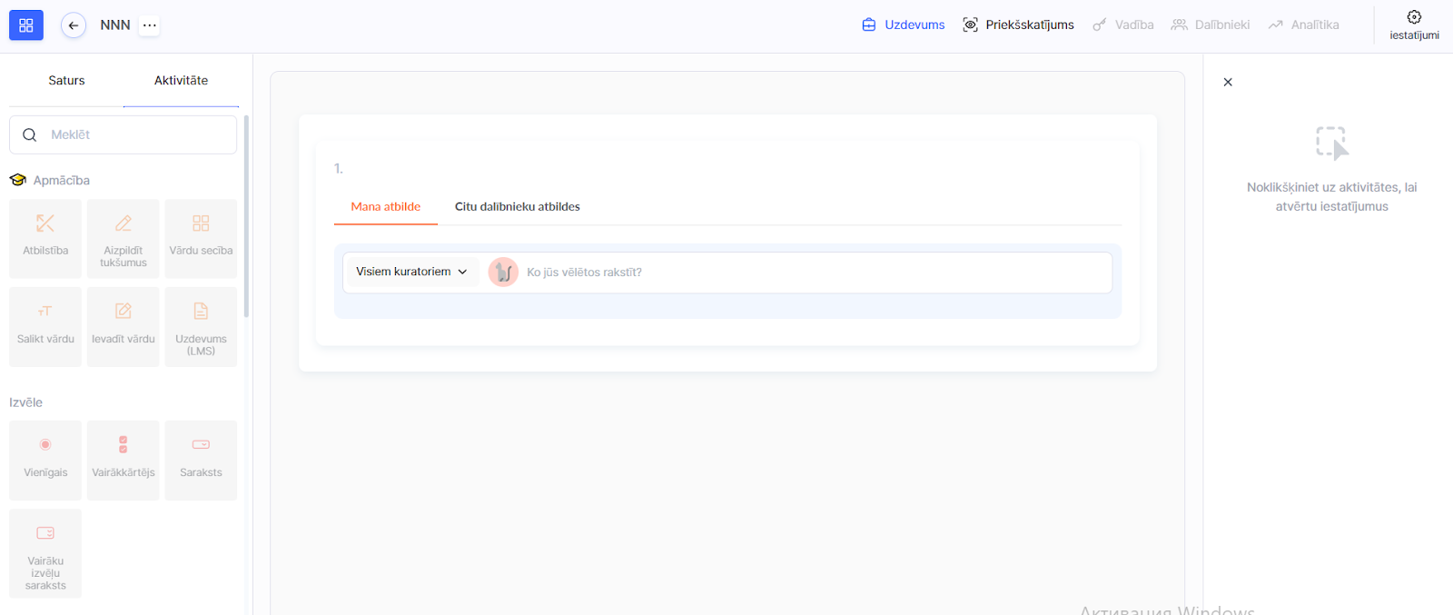 Aizpildiet un konfigurējiet aktivitāti, piemēram, pievienojiet jautājumus un atbilžu variantus.