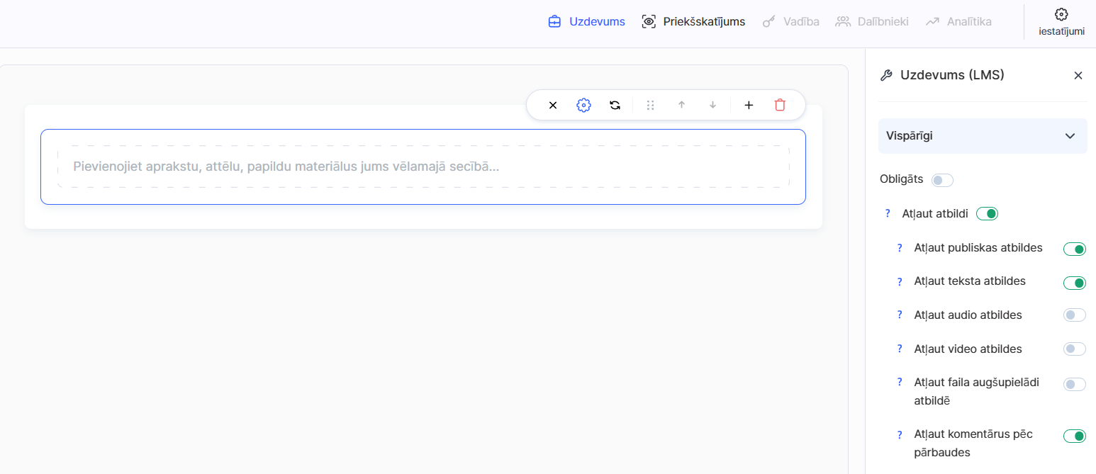 Ieteikums: Ja tas nav tests vai aptauja un nepieciešama atvērta atbilde, ieteicams izmantot jautājuma veidu Uzdevums (LMS).