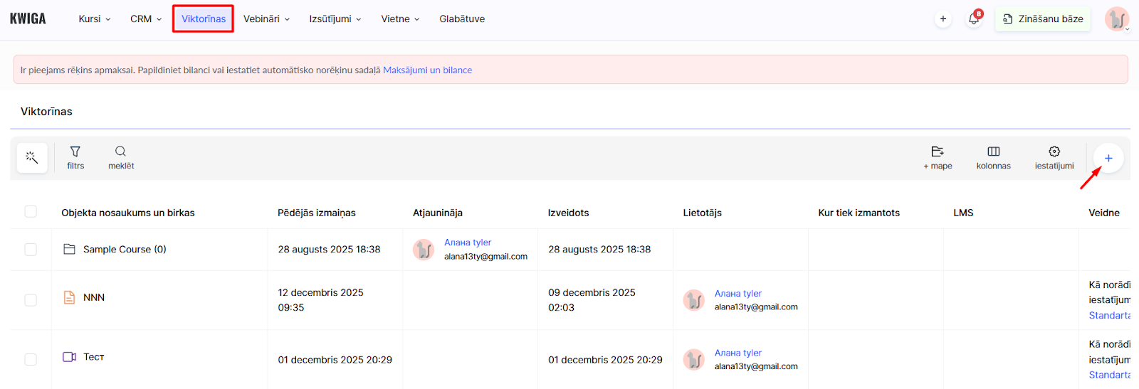 Vispirms ir jāizveido uzdevums, kas tiks izmantots kursā. Uzdevumi tiek veidoti atsevišķi no kursa. Dodieties uz sadaļu Viktorīnas un izveidojiet jaunu uzdevumu.