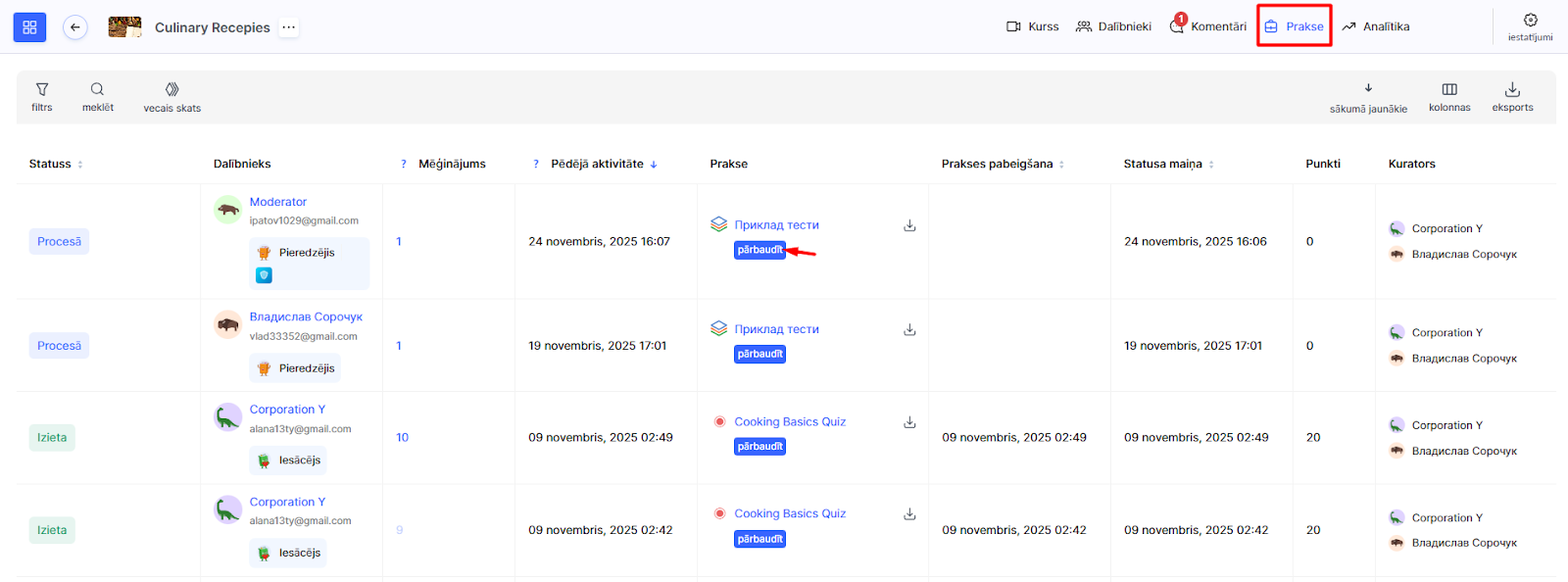 Šī funkcija ļauj kuratoram skatīt studentu atbildes, atstāt komentārus un noteikt izpildes statusu.