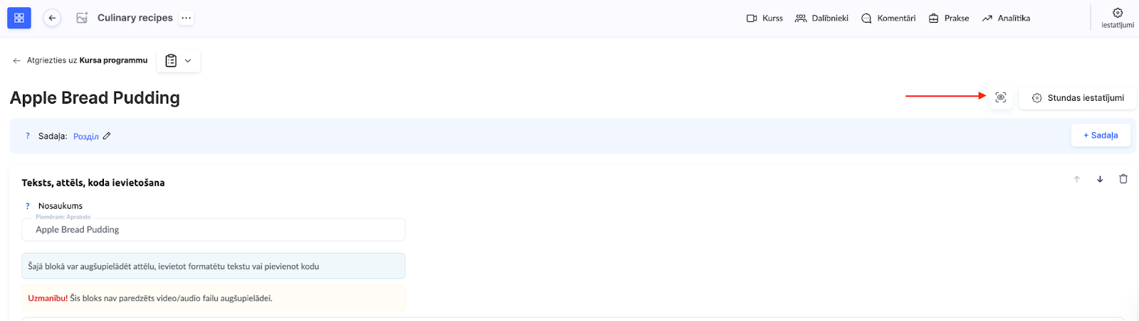Šis režīms ļauj redzēt kursu tā, kā to redz dalībnieki — pārbaudīt materiālu pieejamību, navigācijas ērtumu un visu elementu funkcionalitāti.