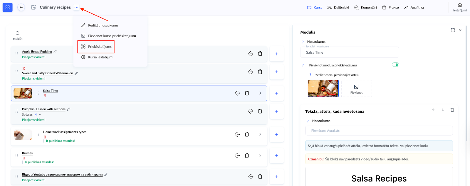 Lai redzētu, kā kurss izskatīsies dažādiem lietotājiem, noklikšķiniet uz trim punktiem blakus kursa nosaukumam augšpusē un izvēlieties pogu Priekšskatījums.