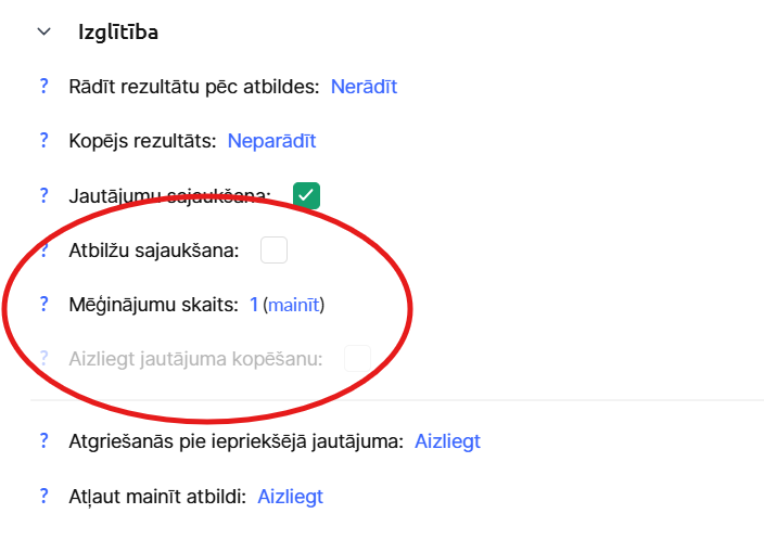 Iestatījumu sadaļā jūs atradīsiet opciju Mēģinājumu skaits. Tā ļauj jums studentiem atļaut atkārtotus mēģinājumus un precīzi noteikt pieejamo mēģinājumu skaitu.