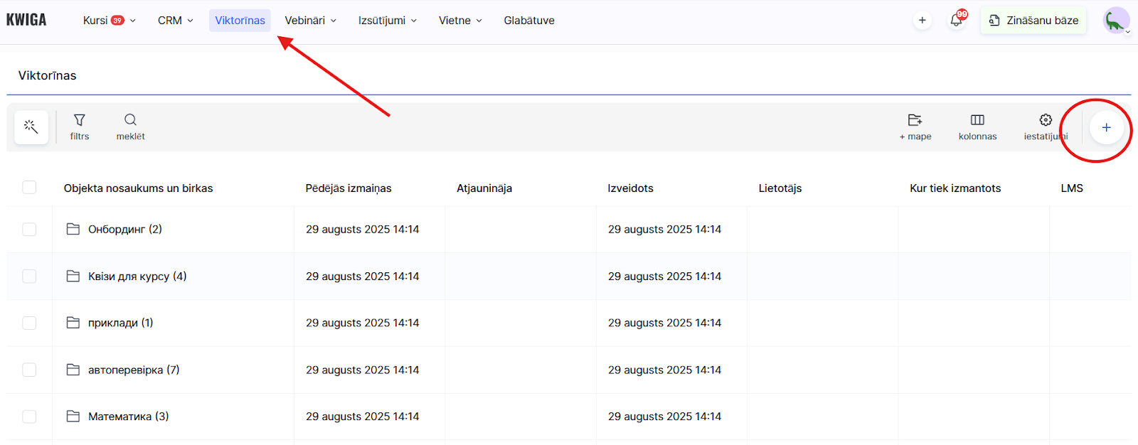 Testa izveide ir ļoti vienkārša – dodieties uz sadaļu Quizzes, noklikšķiniet uz +Quiz, pievienojiet jautājumus un konfigurējiet iestatījumus.