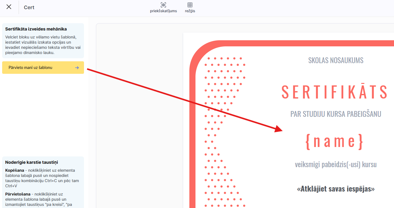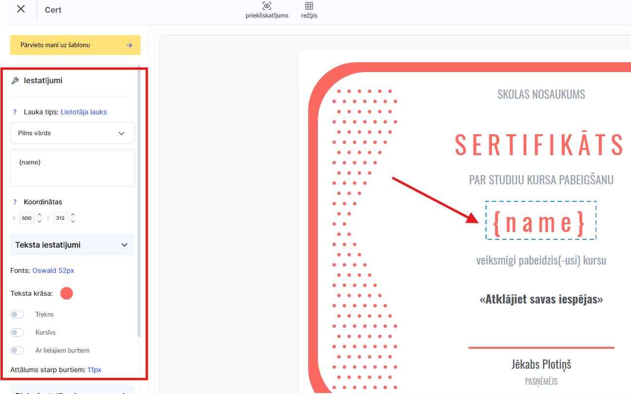 Jūs varat pievienot studenta vārdu sertifikātam, izmantojot mainīgos laukus.