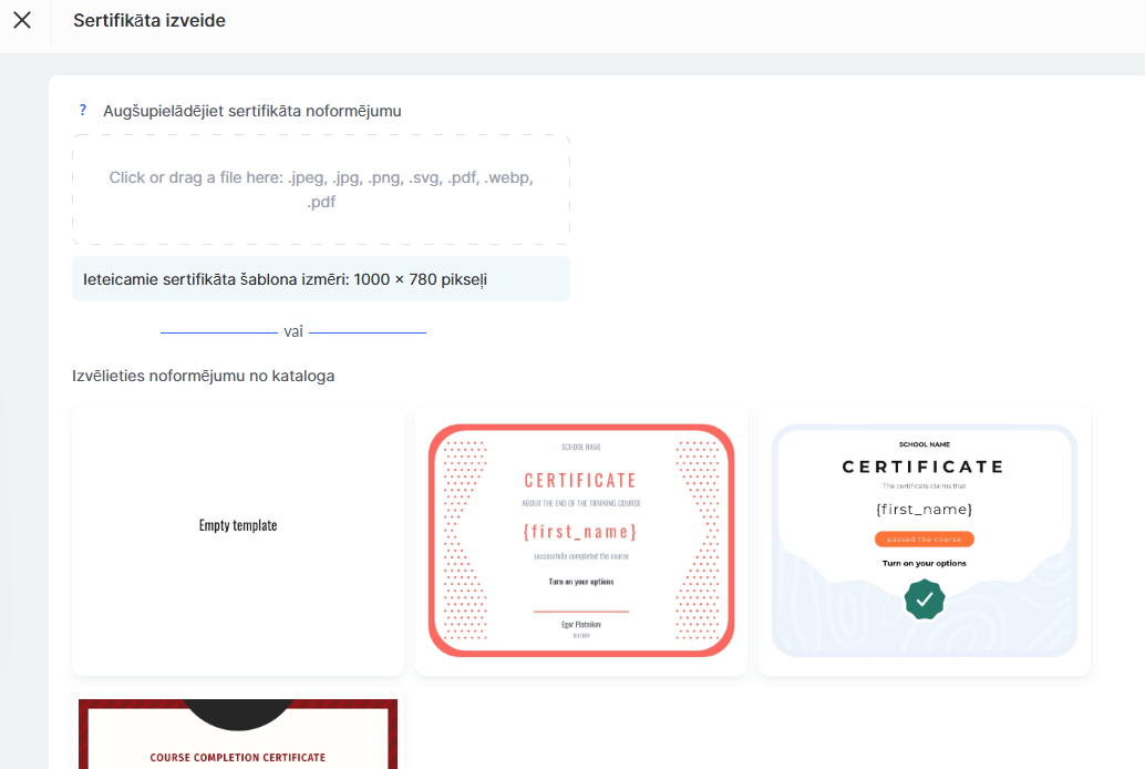 Augšupielādējiet savu sertifikāta dizainu .jpeg, .jpg, .png vai .svg formātā, vai arī izvēlieties kādu no iepriekš sagatavoto veidņu kataloga.