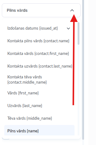 Ja vēlaties manuāli kontrolēt vārdu, kas tiek rādīts uz sertifikāta (piemēram, lai to mainītu vai precizētu, importējot studentu sarakstu), izmantojiet kontaktinformācijas mainīgos savā CRM: