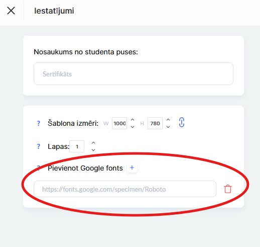 Jūs varat izmantot savu Google fontu sertifikātos, norādot saiti uz izvēlēto fontu.