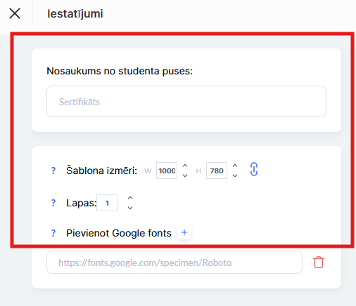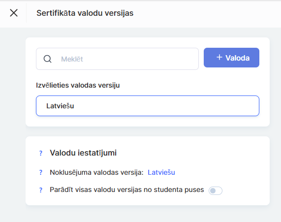 Jūs varat konfigurēt sertifikātu vairākās valodu versijās (pievienojot jaunu versiju ar pogu +Valoda), neatkarīgi no valodas, kas izmantota dizaina veidnē.