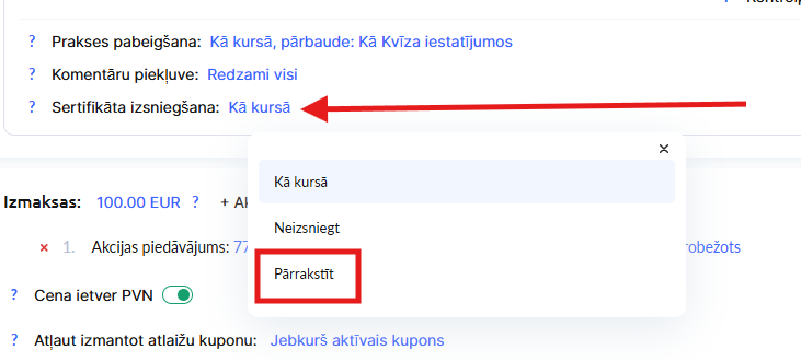 Piezīme: Ja konkrētam cenu plānam ir piešķirts atsevišķs sertifikāts, tas būs prioritārs pār vispārējo kursa sertifikātu.