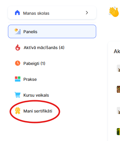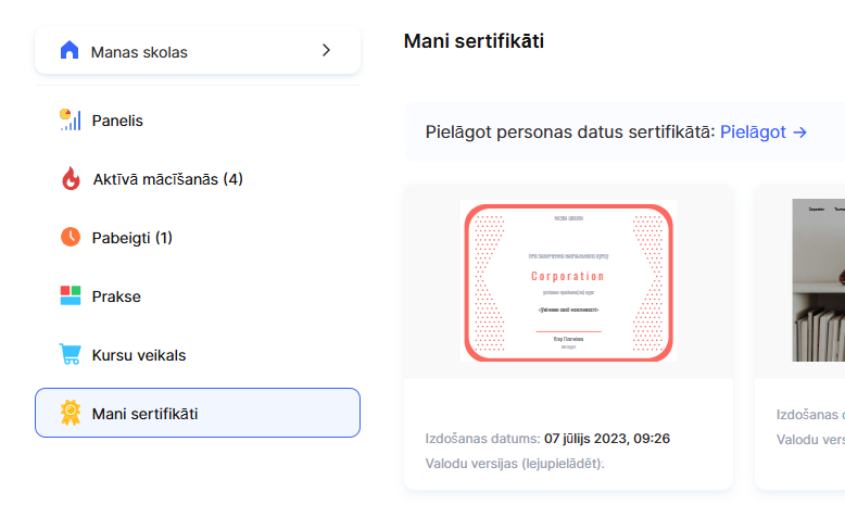 Sertifikāts kļūs pieejams uzreiz pēc tam, kad dalībnieks būs pabeidzis norādīto nodarbību.