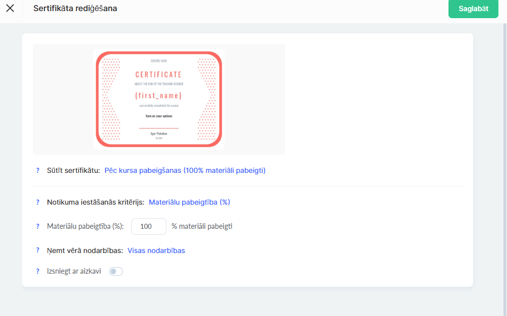 Pēc noklusējuma sertifikāts tiek izsniegts, kad ir izpildīti 100 % uzdevumu un noskatītas visas nodarbības. -