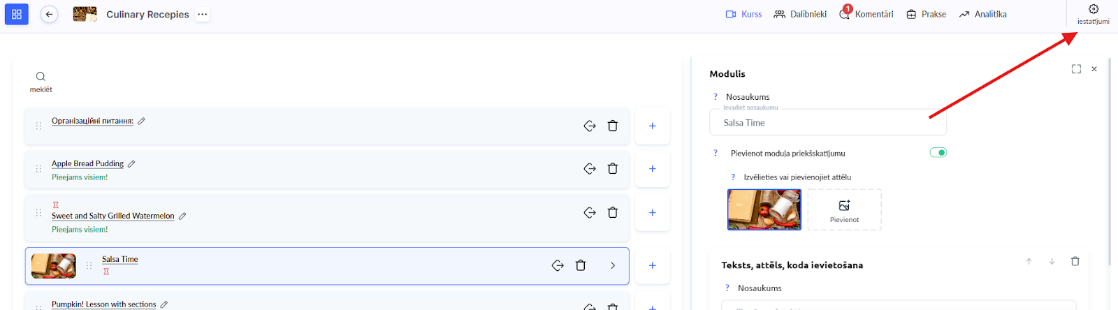 Izvēlnē Kursi atrodiet vajadzīgo kursu un atveriet tā Iestatījumus.