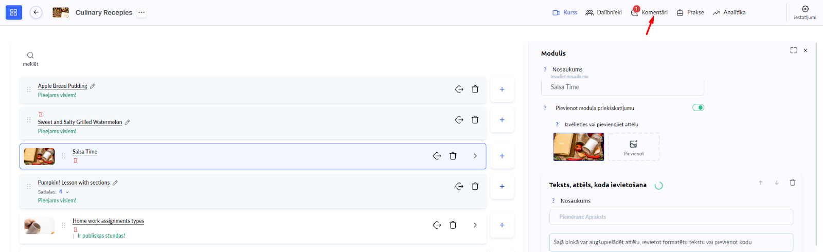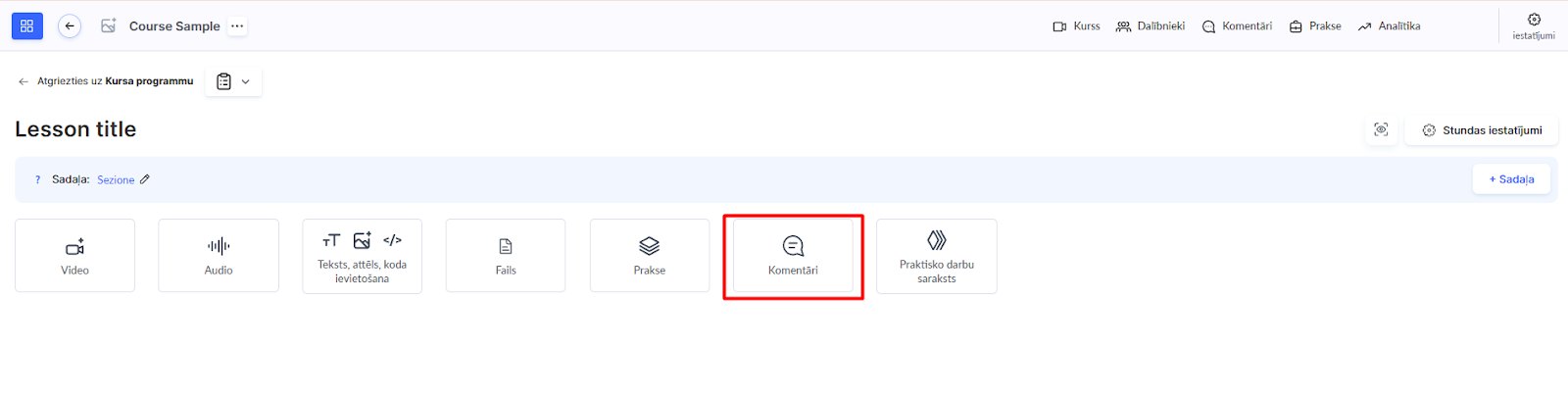 Lai pievienotu komentāru bloku, atver kursu, dodies uz vajadzīgo nodarbību un izmanto pogu Komentāri, lai ievietotu ievades lauku komentāriem tur, kur tas nepieciešams.