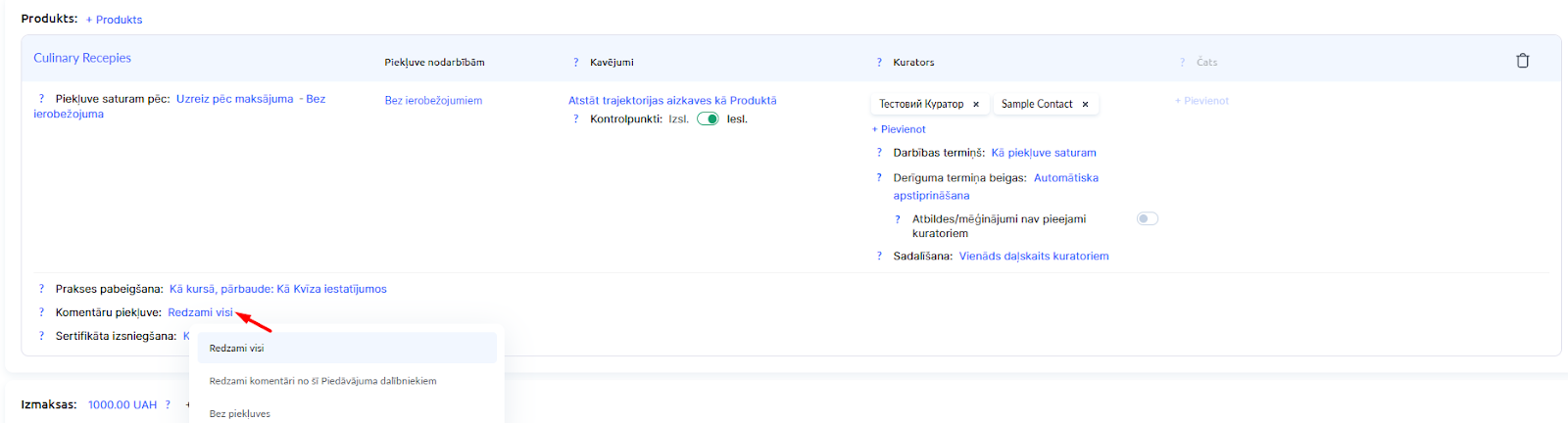 Piekļuve komentāriem tiek pārvaldīta piedāvājuma iestatījumos. Tas sniedz pasniedzējiem elastību — tu pats vari izlemt, vai izmantot šo rīku konkrētā kursā. Piemēram, vienā tarifu plānā var būt iekļauta piekļuve komentāriem, bet citā — nē.