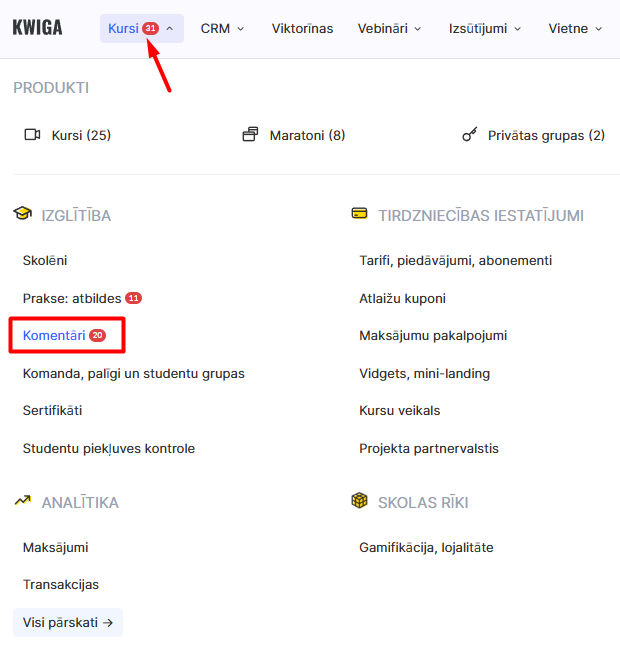 Katram kursam ir sava Komentāru izvēlne, kurā var skatīt visus komentārus, moderēt tos vai atbildēt tieši nodarbības kontekstā.