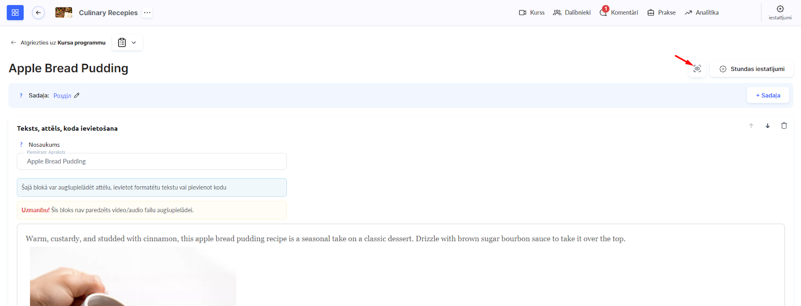 Veidojot un rediģējot kursu, jūs strādājat kursa redaktorā, kur pieejami dažādi iestatījumi, ko studenti neredz.