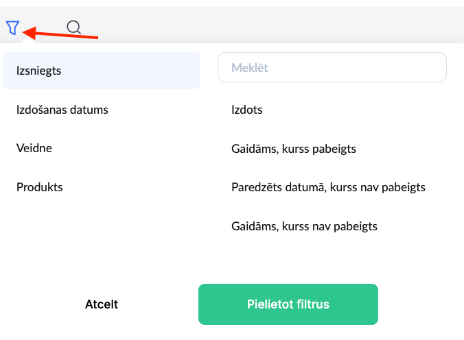Pārskata augšdaļā ir pieejams rīks Filtrs, kas ļauj atlasīt sertifikātus pēc dažādiem kritērijiem. Tas ir īpaši noderīgi, ja nepieciešams atrast konkrētus dokumentus starp lielu ierakstu skaitu.