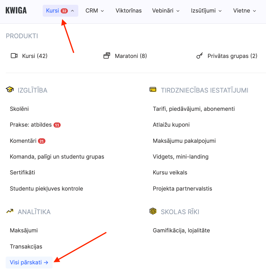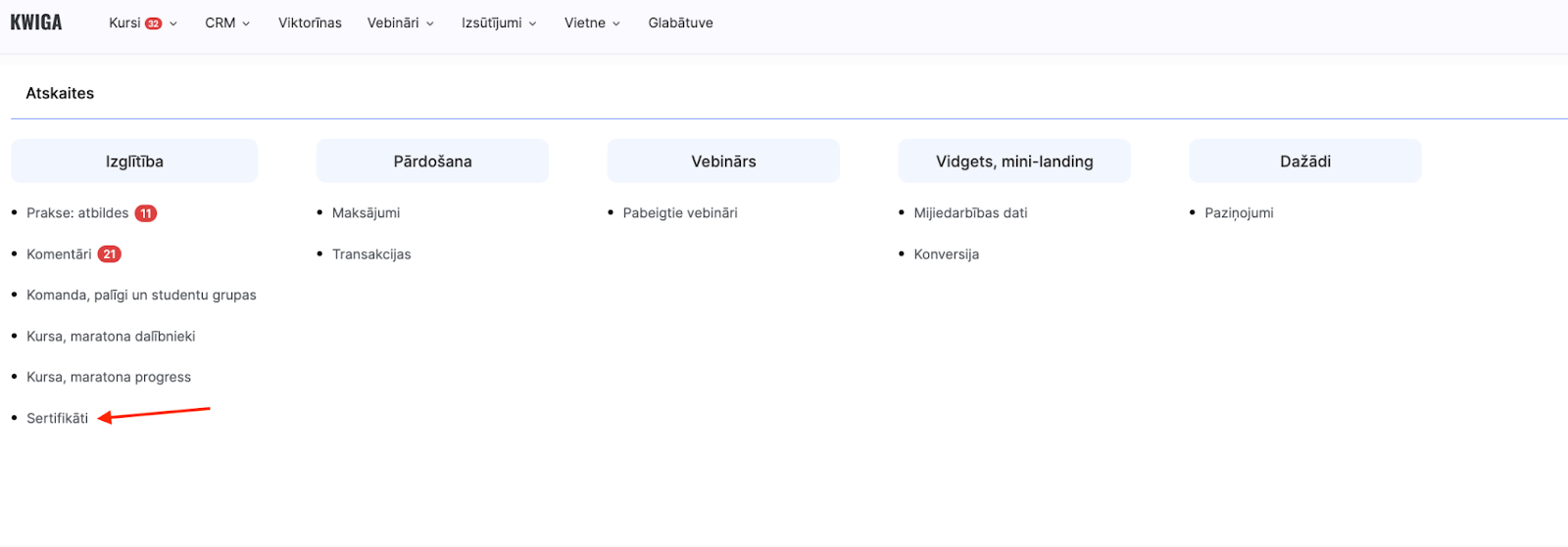 Lai atvērtu sertifikātu pārskatu, dodieties uz izvēlni Kursi → Visi pārskati