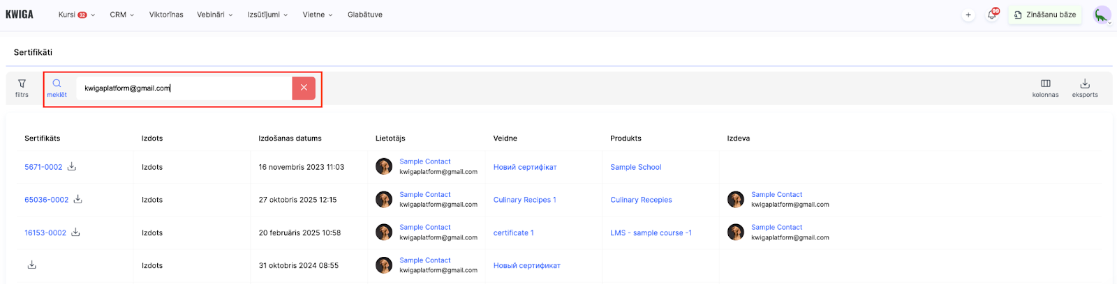 Vienkārši ievadiet skolēna vārdu vai viņa e-pasta adresi meklēšanas laukā, un sistēma atlasīs rezultātus, parādot visus sertifikātus, ko šis lietotājs ir saņēmis. Tas ir ērti, lai pārbaudītu viena skolēna sertifikācijas vēsturi vai sagatavotu pārskatus par viņa sasniegumiem.