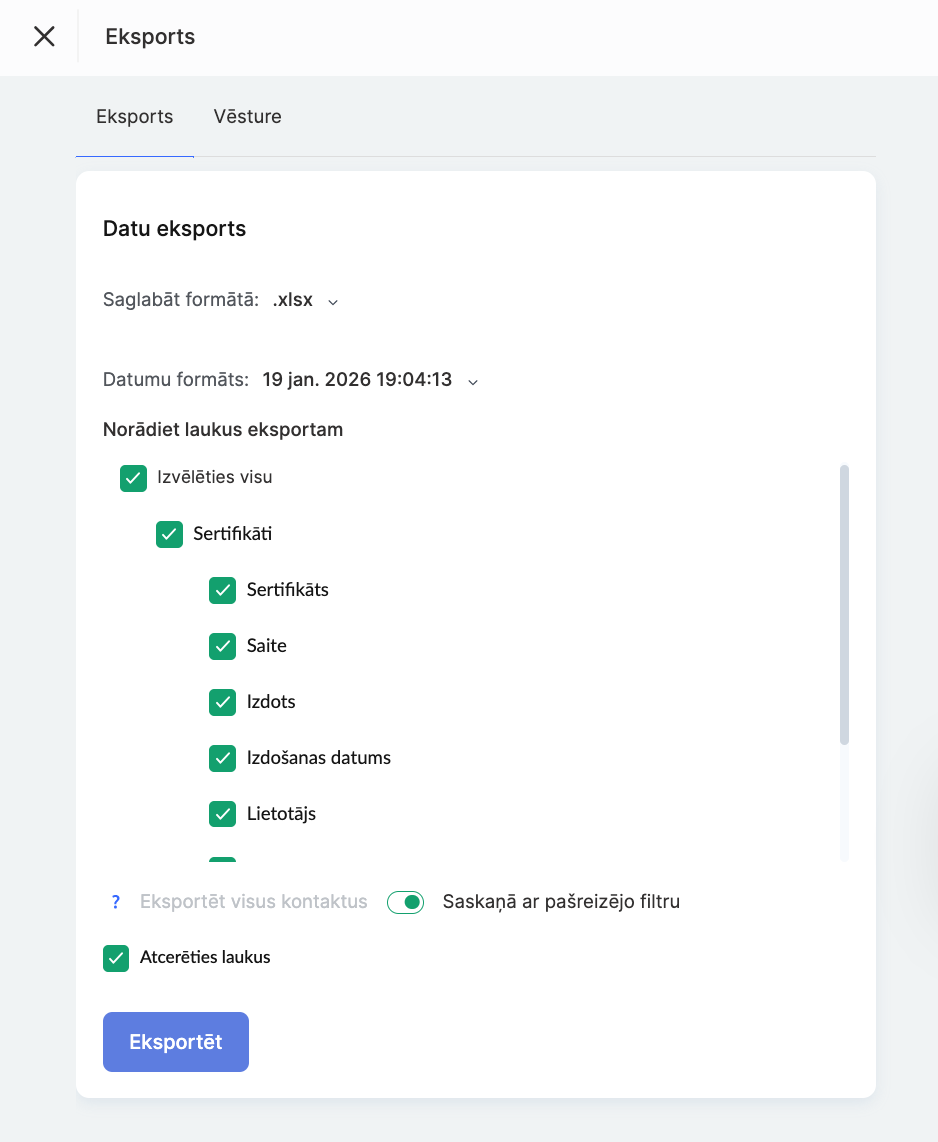 Eksportēt — iespēja eksportēt sertifikātu datus ārējā failā turpmākai apstrādei vai arhivēšanai.