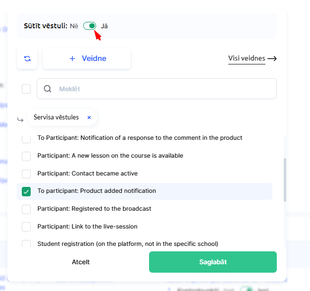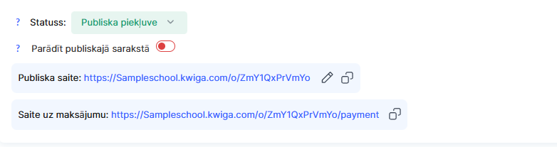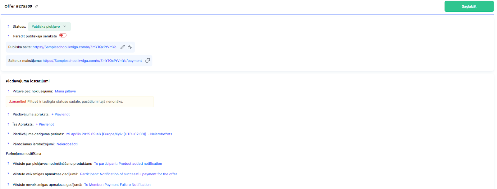 Papildus varat izvēlēties, vai piedāvājums ir pieejams tikai ar tiešo saiti (tas NETIKS rādīts publiskajā sarakstā), vai arī dalībnieki var tam piekļūt un iegādāties to tieši kursa lapā (šādā gadījumā tas tiks rādīts publiskajā sarakstā).