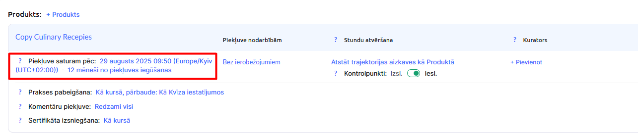 Pirmajai palaišanai mēs iesakām publicēšanas grafiku konfigurēt tieši kursā (sadaļā Nodarbību datumi un termiņi), lai nebūtu jāpielāgo termiņu iestatījumi piedāvājuma līmenī.